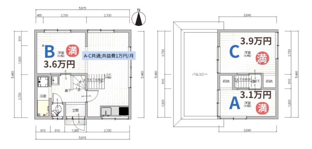 家賃(部屋により変動)+ 共益費(光熱費込み) 1万円/月 ※敷金・礼金など初期費用なし/共益費は毎月一定