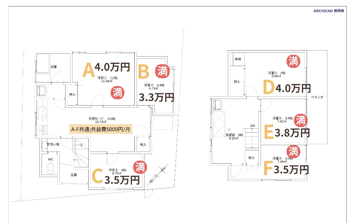 家賃(部屋により変動)+ 共益費(光熱費込み)5000円/月 ※敷金・礼金など初期費用なし/共益費は毎月一定
